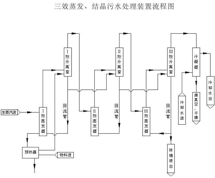 三效蒸發(fā)器主要通過(guò)生蒸汽加熱含鹽廢水,使含鹽廢水蒸發(fā),將鹽、水分離。三效(多效)蒸發(fā)器可利用蒸發(fā)的二次蒸汽,大量的節(jié)約生蒸汽,從而降低運(yùn)行費(fèi)用。